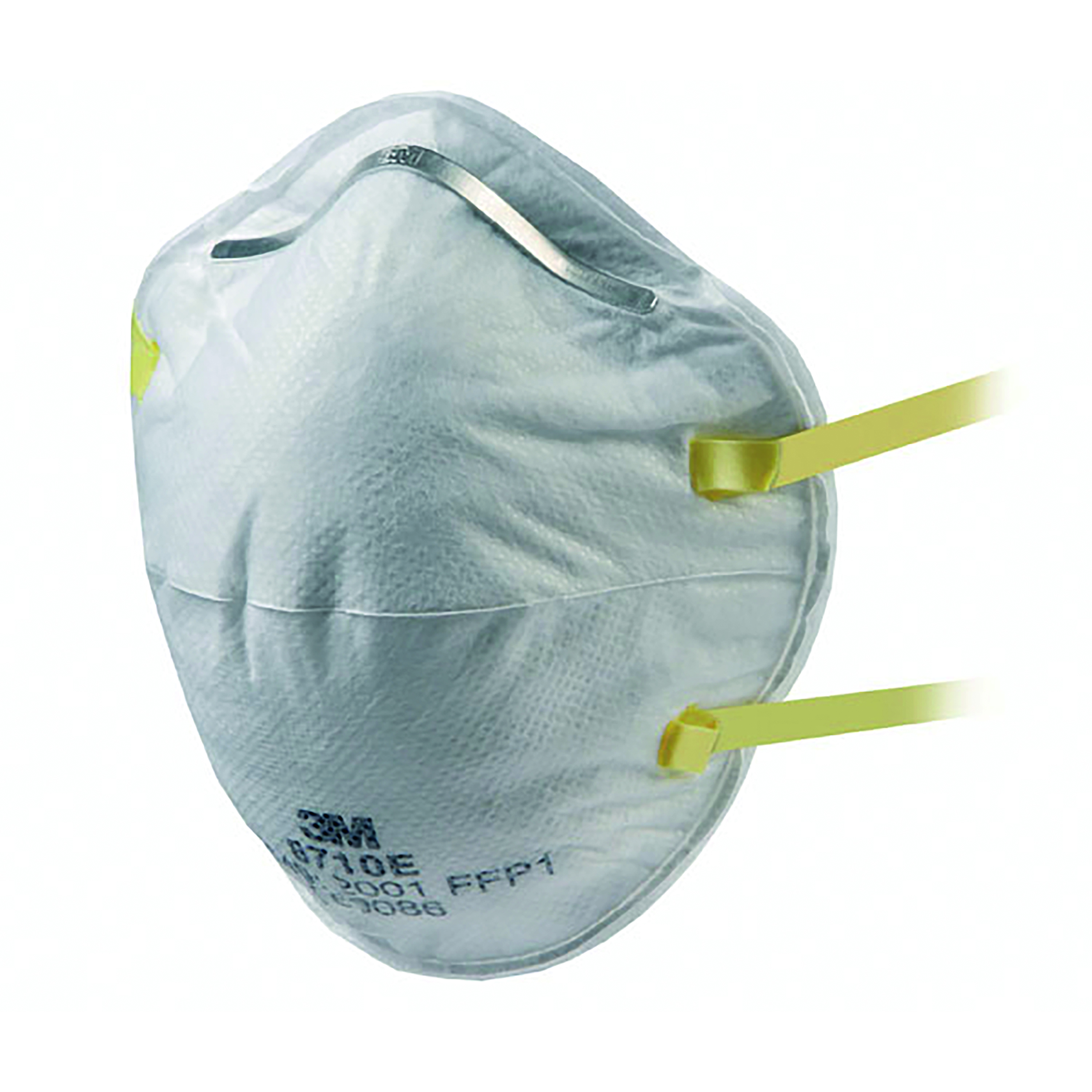 3M 8710E Cup-Shaped Respirator - FFP1 Provides respiratory protection against low levels of fine dusts and mists.Additional Information * Reliable, effective protection against fine particulates* Durable collapse resistant inner shell* Excellent fit over a wide range of face sizes provided by convex shape, nose clip and twin-strap design* Improved weld pattern for stronger attachment of headstrap* Comfortable, lightweight off-the-face design* Yellow colour coded straps denoting FFP1 protection level.Standard: EN149:2001 FFP1Approval: CE MarkedMaximum use level: Assigned Protection Factor: 4 x WEL (Nominal Protection Factor 4 x WEL)