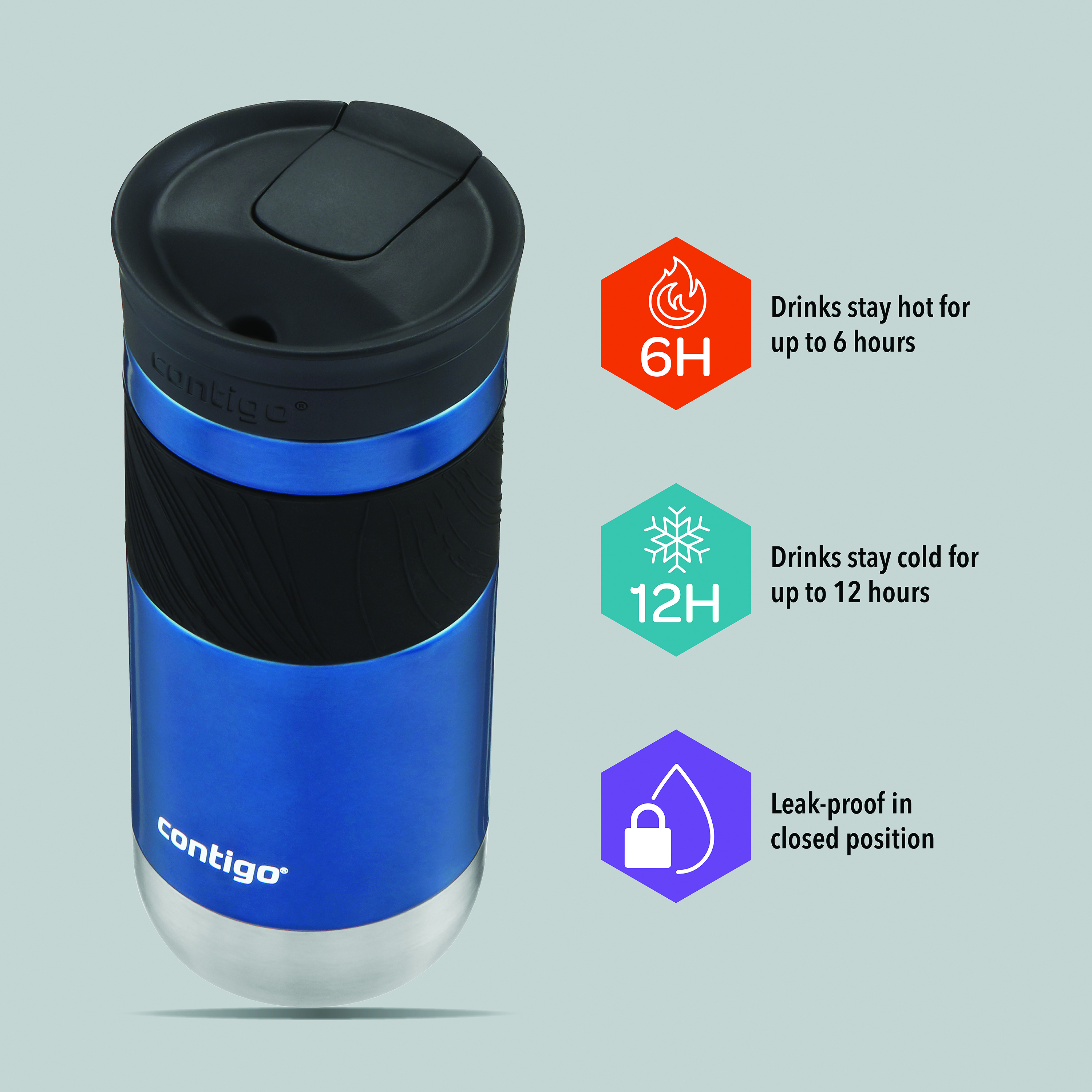 The Contigo Byron 2.0 Snapseal travel mug is a stainless steel vacuum flask, perfect for hot and cold drinks while out and about. With a generous capacity of 470ml, the mug features an easy to clean, removable lid made from BPA-free plastic. This leak-proof tumbler is supplied in a Corn blue finish with stainless steel interior and contrasting black grip band. Keeping drinks hot for up to six hours and cold for up to 12 hours, the Contigo Byron 2.0 travel mug is leak-proof when the lever is in closed position.