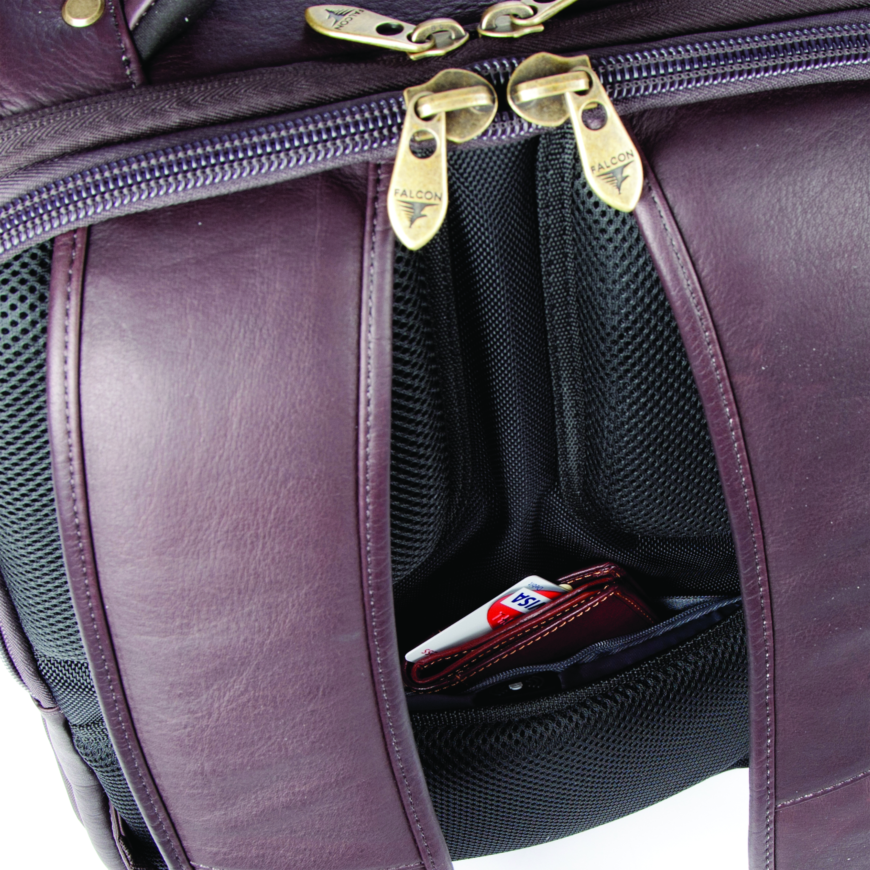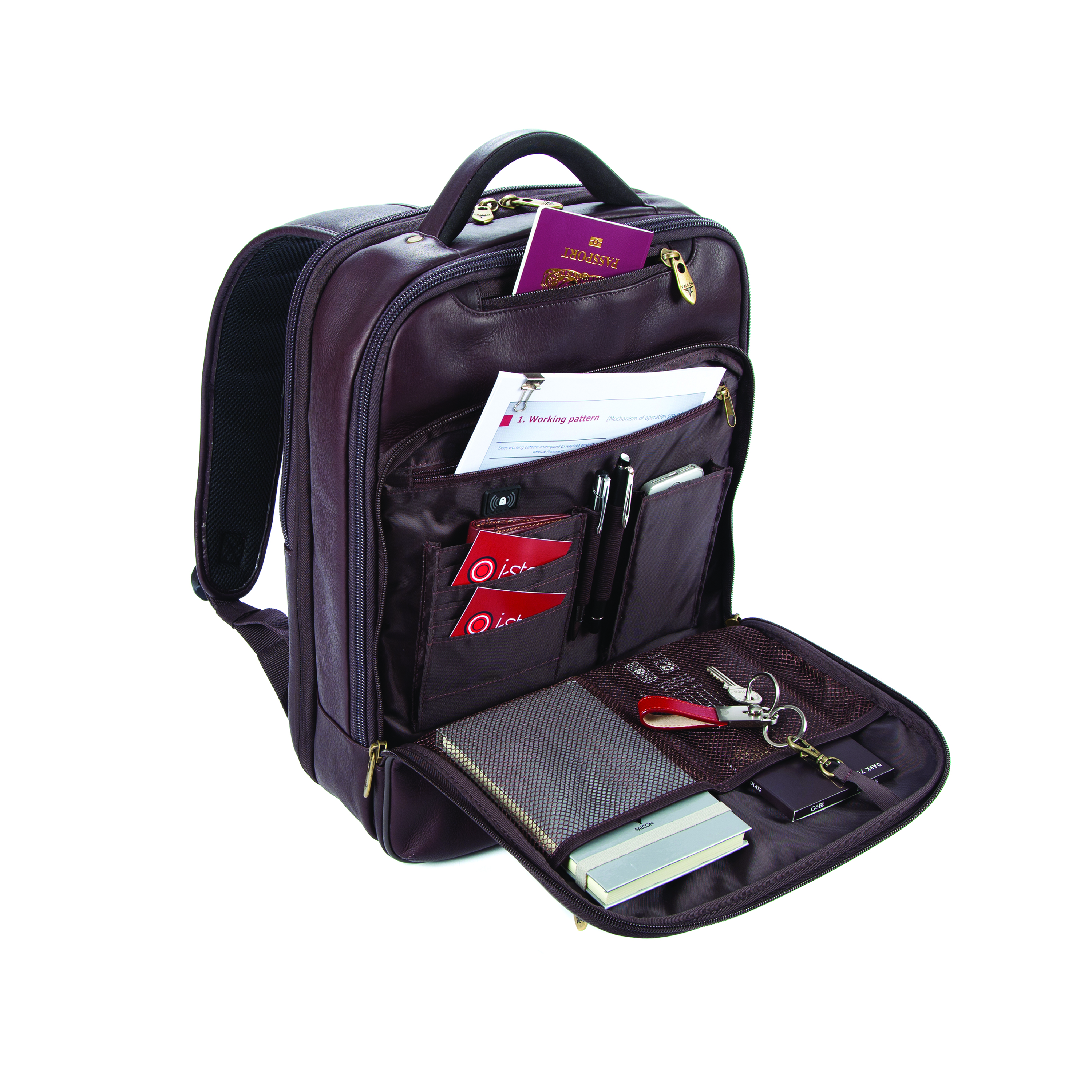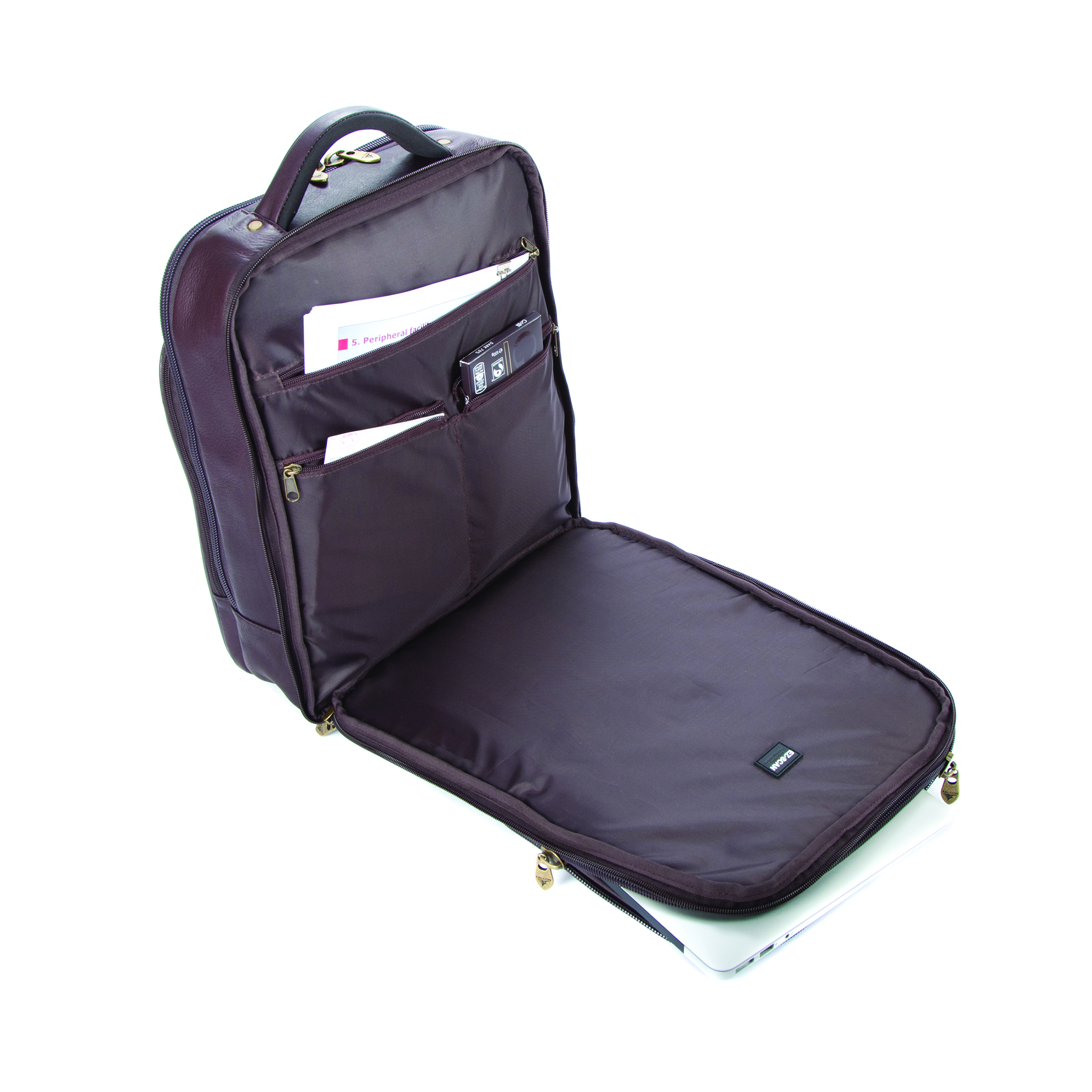 The Falcon Backpack Full Grain Luxury Leather with a padded laptop section for laptops up to 15.6 inches. Made from the finest full grain natural leather. Contains a padded laptop pocket and an additional tablet pocket for tablets up to 10,1 inches. Cushioned and gunmetal riveted carrying handle. TSA Checkpoint friendly laptop compartment. 3 external front zipped pockets perfect for easy access and an internal luggage compartment.