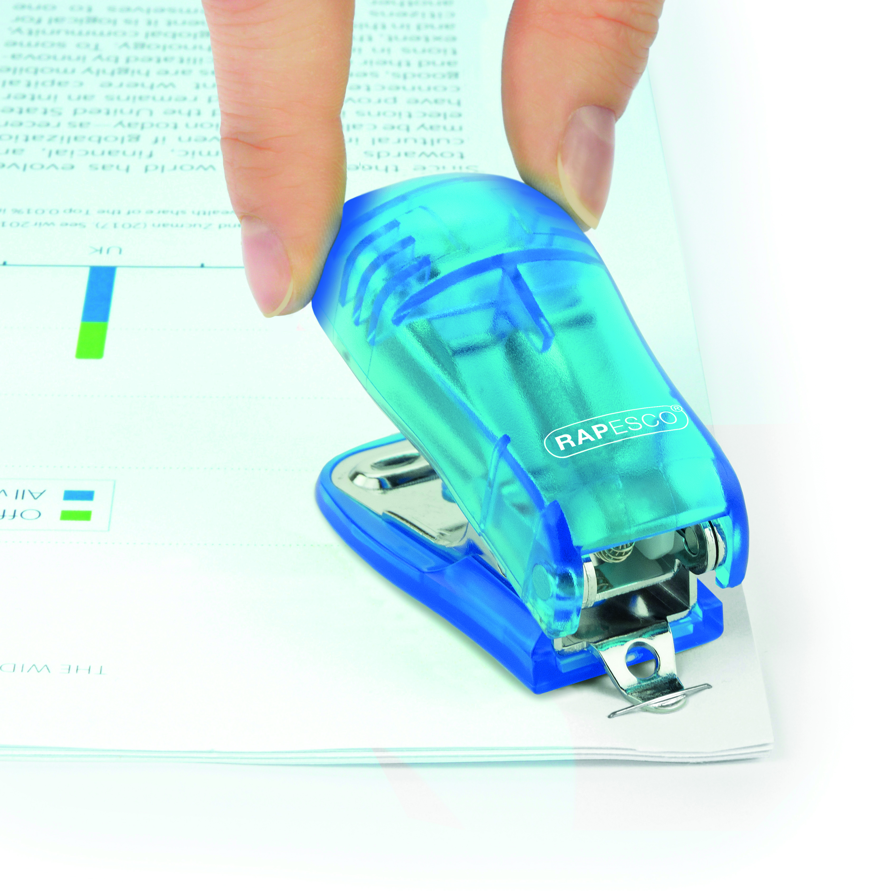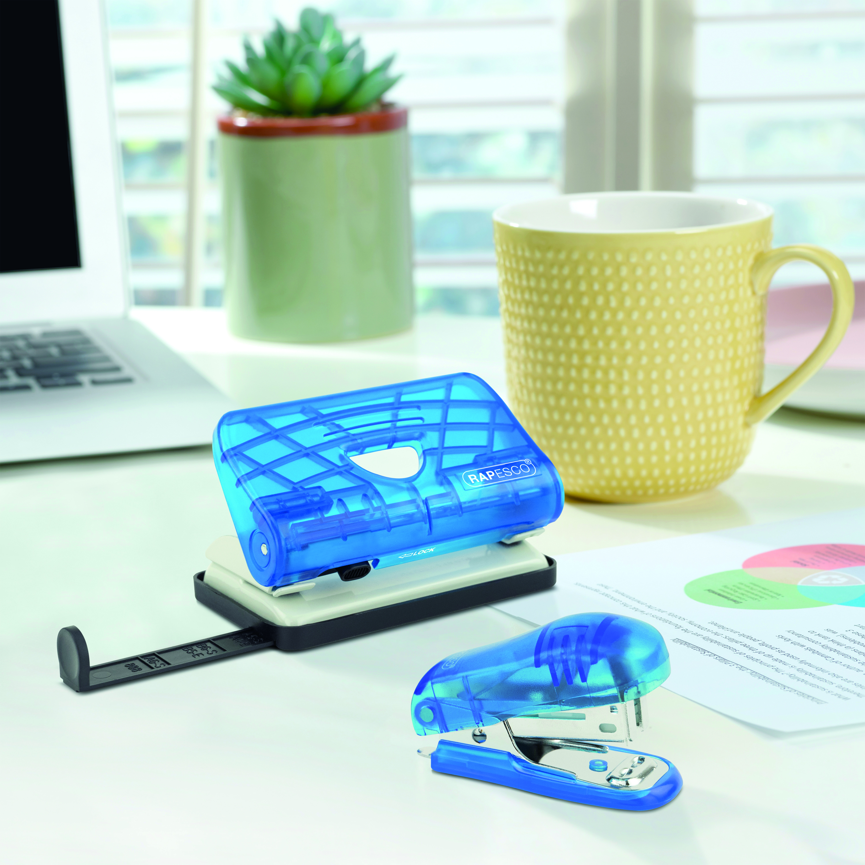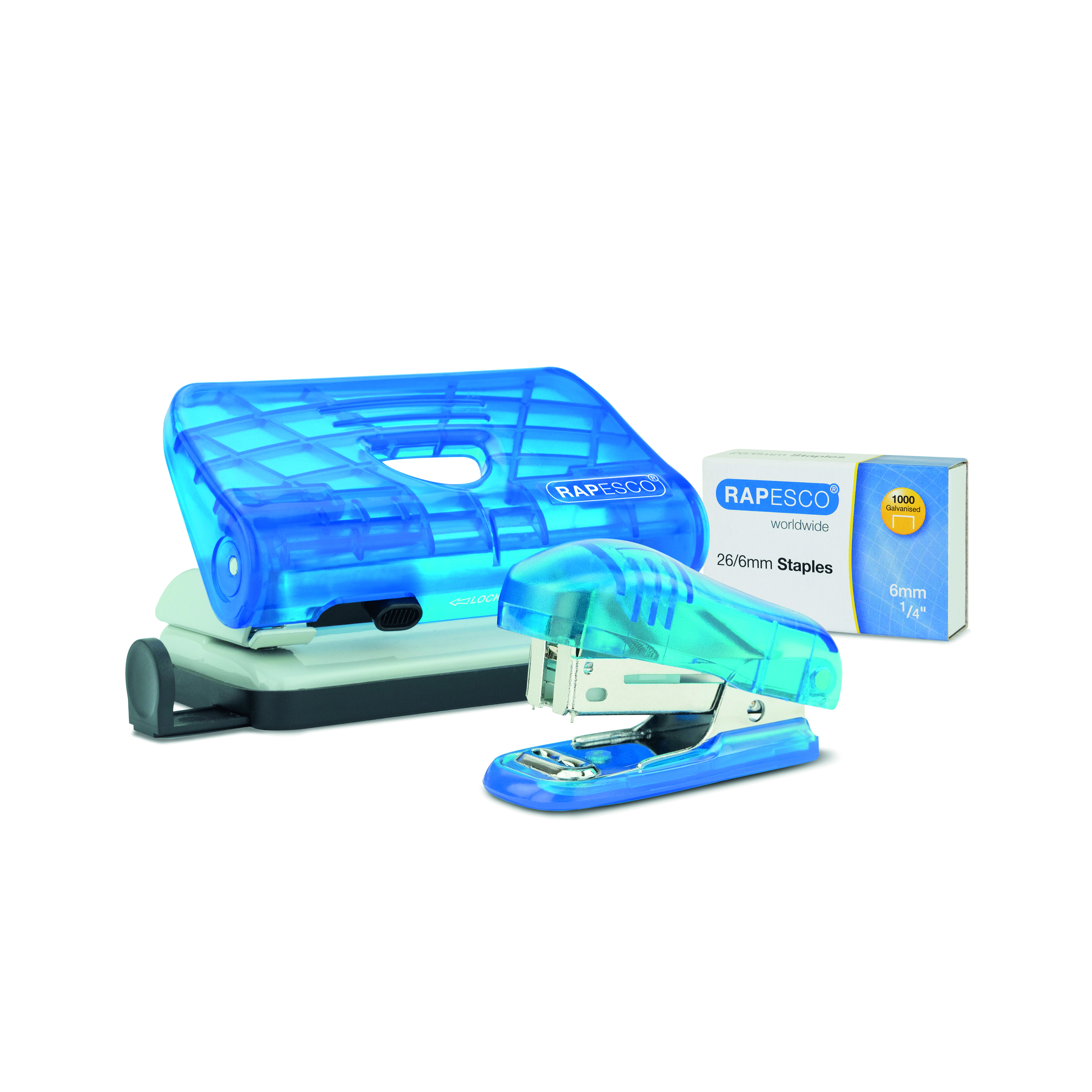 This set includes a handy 2-hole punch with fun, transparent blue ABS housing and a matching compact mini stapler. A box of 1,000 standard 26/6mm staples is also supplied with the set, for an immediate start. The compact design allows the set to fit easily in a work bag or larger pencil case, making it suitable for students or users on the move. The fun and colourful hole punch and Mini Bug stapler are capable of punching or stapling up to 12 sheets of 80gsm paper at a time. Practical for light-duty stapling and punching at home, school or office. The stapler is quick and simple to refill thanks to the top-loading mechanism, and the integrated staple remover at the rear removes staples easily without damaging the paper.
